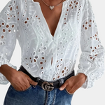 Adopta la elegancia bohemia sin esfuerzo con la Blusa Alba con Ojal. Confeccionada en encaje ligero y detallada con delicados bordados de flores recortadas, esta blusa es una verdadera declaración de encanto libre. El escote en V profundo añade un toque de feminidad, mientras que el corte holgado y los puños elásticos la mantienen cómoda y fresca.