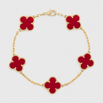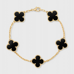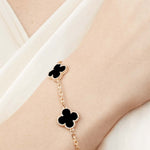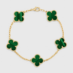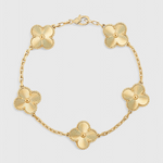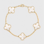Delicada y distintiva, esta pulsera bañada en oro presenta una serie de icónicos motivos de trébol para un look que combina la belleza atemporal con un encanto elegante. Ya sea llevada sola o en capas, añade un acabado refinado a cada atuendo, desde conjuntos diarios hasta sofisticación nocturna.